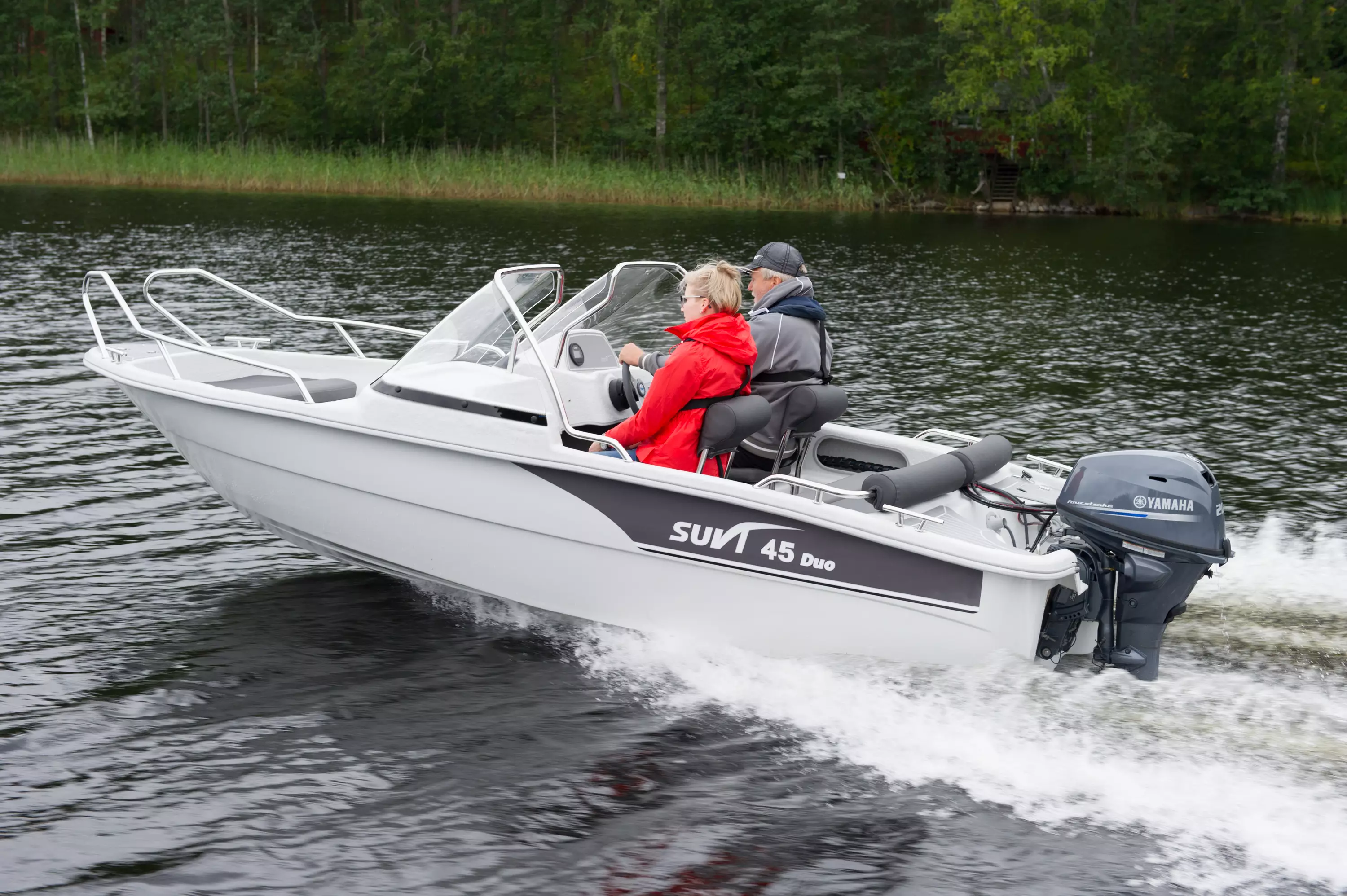 45 Duo on Suvin suosittujen Duo-mallien pikkusisko. Näin myös hieman pienenemmän ja edullisemman veneen ostajat pääsevät nauttimaan tuplapulpettiveneen eduista ja ominaisuuksista. 45 Duo on hyvillä vakiovarusteilla varustettu malli mökki- ja kalastuskäyttöön. Säilytystilaa veneessä on reilusti kokoonsa nähden. Myös köysi/ankkuriboxit löytyvät edestä ja takaa. Veneen maksimi moottorisuositus on 30 hv, jolla vauhtia tulee n. 26 solmua 1 hlö:n kuormalla ja n. 23 s 4 hlö:n kuormalla. Sadevesityhjenevä. Pitkärikiselle moottorille. Vakiovarusteena mm. laminaattisarja ja kölirauta